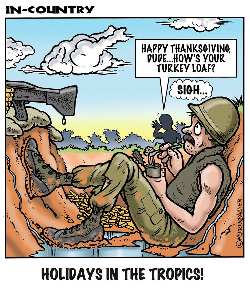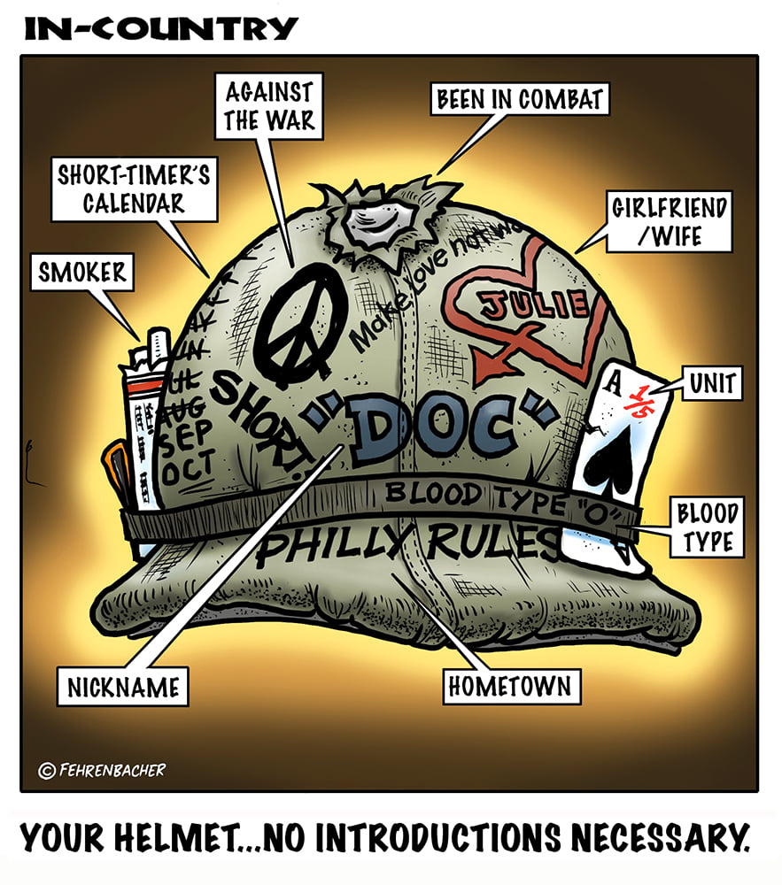 Phil enlisted in the Army in 1965 where he served for years in Vietnam. He became a graphic designer and has worked for the state of Oregon for 26 years. He retired in 2003 and started the Cartoon "In-Country". The cartoons reflect his experiences during his tour of duty in South Vietnam.
